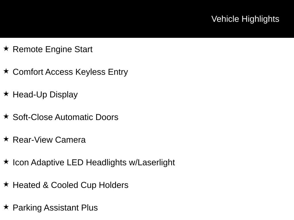 - Executive Package: Remote Engine Start, Heated & Cooled Cup Holders, Rear Manual Side Window Shades, Soft-Close Automatic Doors, Icon Adaptive LED Headlights with Laserlight