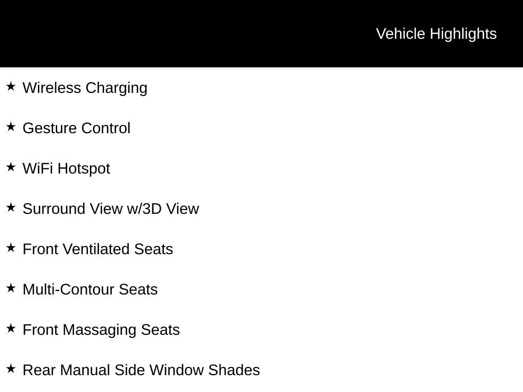 - Luxury Seating Package: Front Ventilated Seats, Multi-Contour Seats, Front Massaging Seats