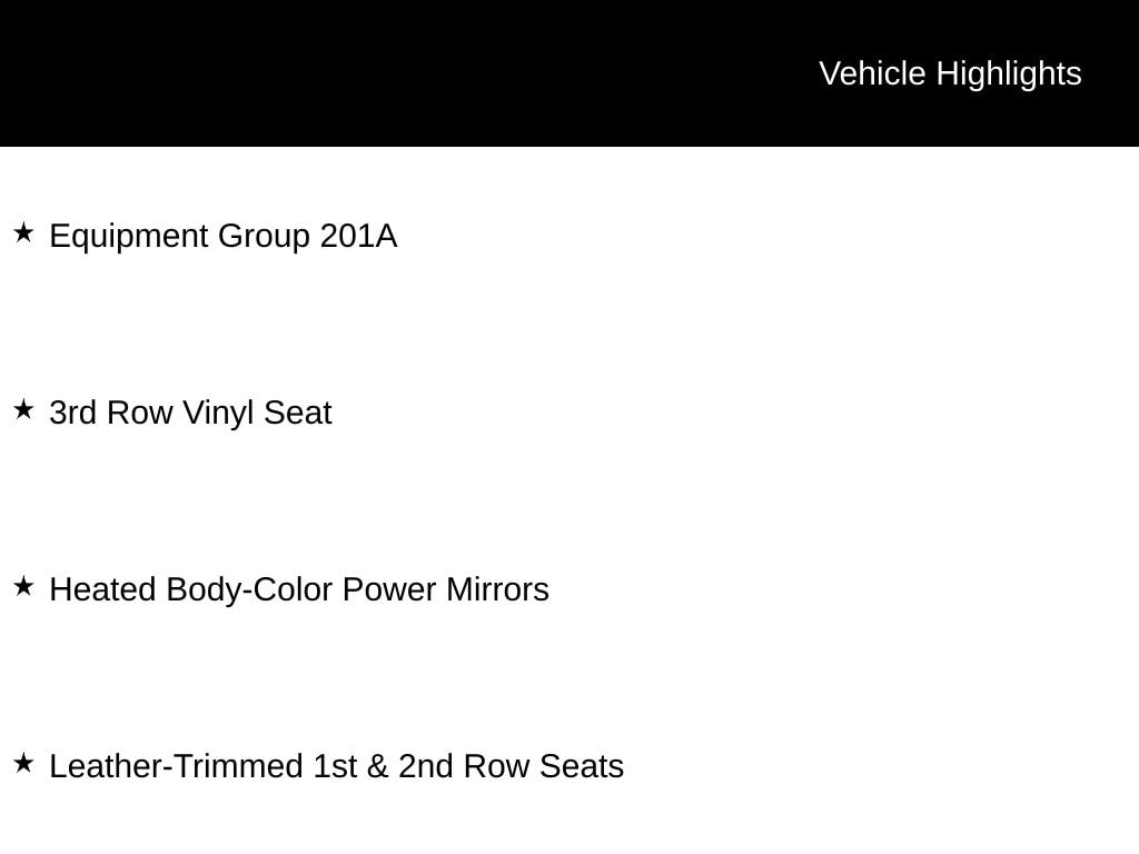 3rd Row Vinyl Seat, Equipment Group 201A, Heated Body-Color Power Mirrors, Leather-Trimmed 1st & 2nd Row Seats.